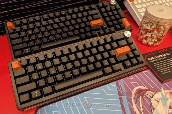 XPG также оставила немного места на стенде для своей новой линейки игровых клавиатур Sorcerer — стандартная модель представляет собой «полноразмерную» плату с форм-фактором 96 %, доступную в черном или белом цвете. Простая эстетика Sorcerer может быть нарушена несколькими (тремя) дополнительными клавишами с акцентом XPG. Серебристый диск управления, похоже, является стандартным креплением. Конструкция с прокладкой и тройным пенополиуретановым слоем обеспечивает изысканный и приятный набор текста. XPG оснастила Sorcerer специальными переключателями Red и системой RGB-подсветки на каждую клавишу (управляется и настраивается с помощью программного обеспечения XPG Prime).