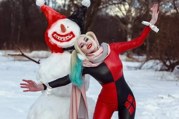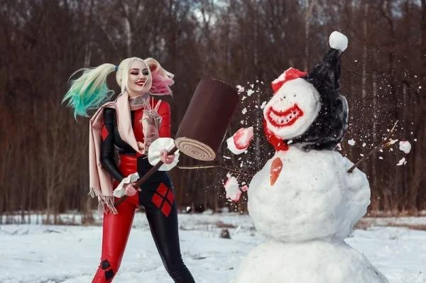 Редкое сочетание: Харли Квинн и зима. В Готэме снег редкое явление, тем более полноценные сугробы. У Виктории Кот вышел креативных образ.