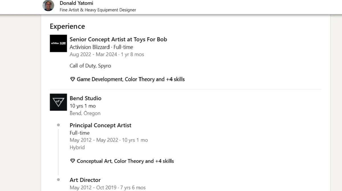 Свежей зацепкой мы обязаны художнику и дизайнеру Дональду Ятоми, который работал в Toys For Bob в период с августа 2022 года по март 2024 года. Он застал период, когда студия ещё была частью Activision Blizzard. И Ятоми, согласно его странице в LinkedIn, всё это время занимался двумя франшизами: Call of Duty и Spyro.