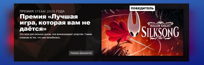 Обложка: скриншот игры Hollow Knight: SilksongValve объявила победителей «Премии Steam 2025» — это лучшие игры прошлого года по мнению пользователей платформы. Напомним, что голосование запустили одновременно с Зимней распродажей.