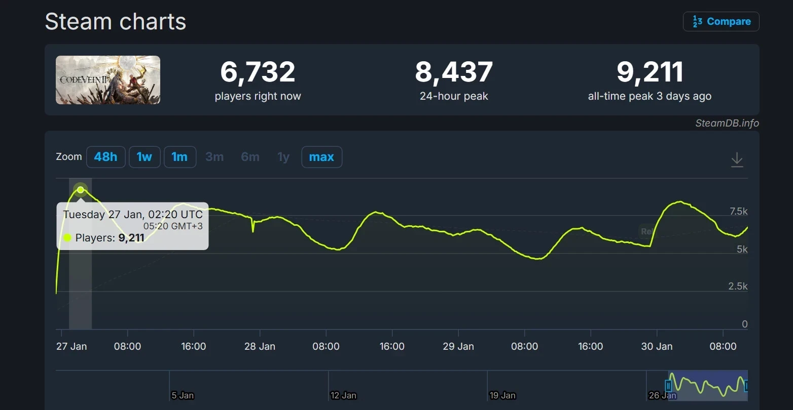 Что касается пикового онлайна в Steam, то вскоре после выхода Code Vein 2 в расширенном доступе он превысил отметку в девять тысяч игроков. При этом за последние 24 часа в экшене находилось менее 8,5 тыс. геймеров на пике. Возможно, ситуация улучшится ближе к вечеру или на выходных.
