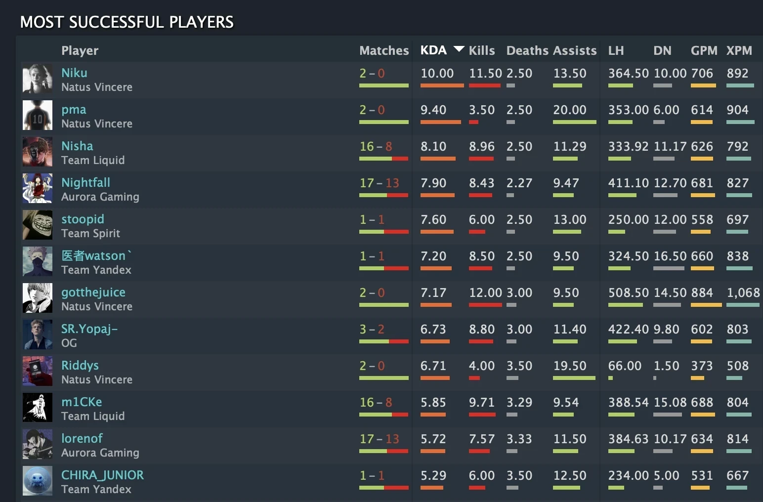 Верхушку топа оккупировали игроки NAVI, сыгравшие на турнире всего две карты без поражений, в то время как остальные участники гриндили статистику на длинной дистанции. Абсолютным рекордсменом турнира стал мидер Артём «Niku» Бачкур со средним показателем KDA 10.00. На своих победных картах он в среднем оформлял 11.50 убийств при всего 2.50 смертях.