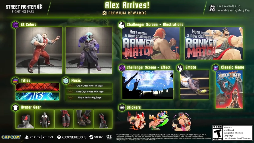Новинки пропуска включают EX-расцветки для Зангиева и Акумы, дополнительные эффекты и иллюстрации, стикеры, эмоцию, музыкальные треки, классическую игру Black Tiger и другой контент. Alex Arrives! доступен для покупки с сегодняшнего дня.
